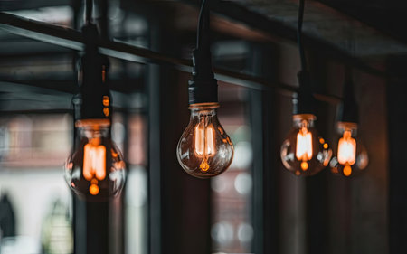 This image showcases an array of warm light fixtures hanging in a cafe, featuring vintage bulbs that create a cozy and inviting atmosphere, perfect for relaxation.