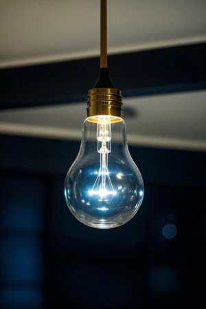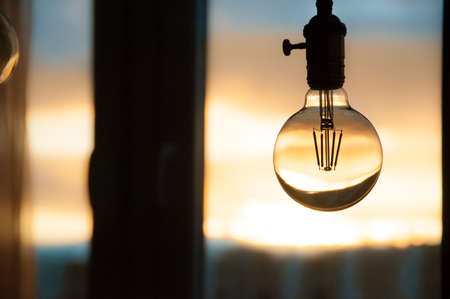 Close up of incandescent light bulb in a modern interior.