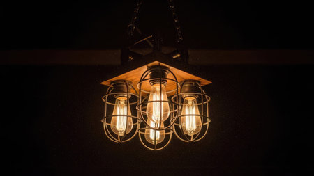 A close-up captures a vintage light fixture, featuring three illuminated bulbs encased in wire cages. The warm light contrasts with the dark background, highlighting the fixture's metal and wooden elements. This image could be suitable for design, interior, or architectural concepts and commercial applications.