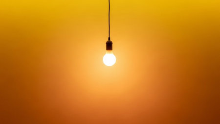 A single, incandescent light bulb hangs suspended by a cord against a warm, softly blended gradient background of yellow and orange hues. The bulb is brightly illuminated, casting a warm glow that radiates outwards. The composition is minimalist and clean, focusing solely on the light source and its effect. evokes concepts of ideas, inspiration, energy, and illumination.