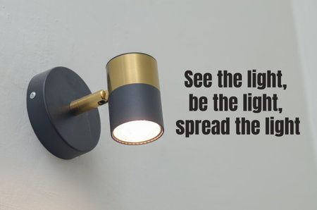 Inspirational Quote on Light: A modern wall lamp illuminates a powerful message: See the light, be the light, spread the light, symbolizing positivity and guidance.