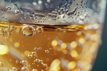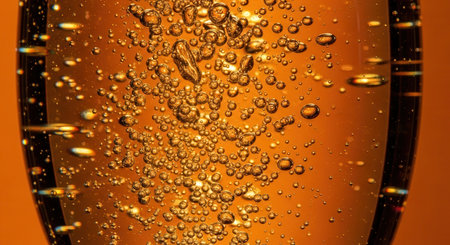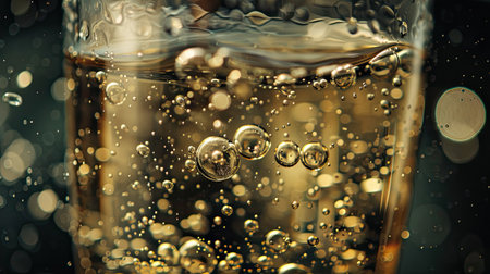Golden effervescent bubbles rapidly rising in a clear glass of sparkling beverage. dynamic macro view of fizz and carbonation, creating an abstract liquid texture.