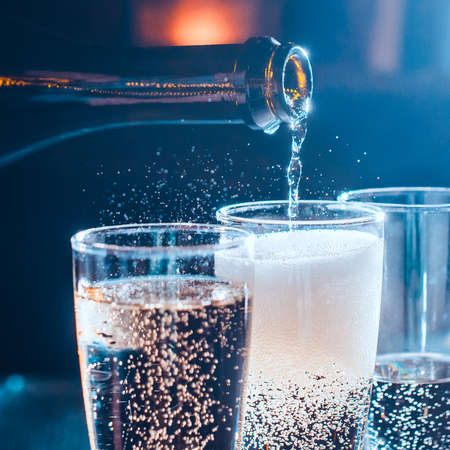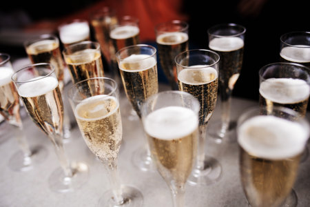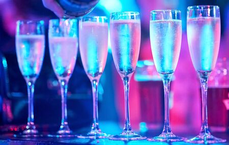 Party and holiday celebration concept. Many glasses of champagne on the table in the restaurant. Toned image. The process of bottling champagne in glasses. close up view