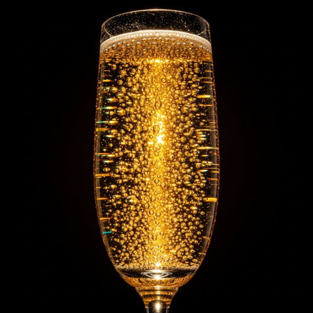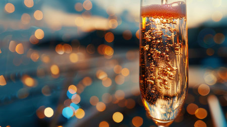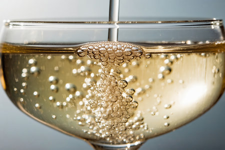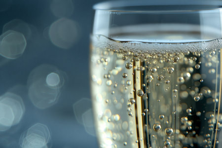 A glass of champagne with bubbles in it. The bubbles are small and scattered throughout the glass. Concept of celebration and enjoyment, as the bubbles suggest that the champagne is being poured