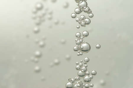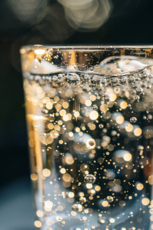 Macro shot of a glass of sparkling water with rising bubbles and a bokeh effect