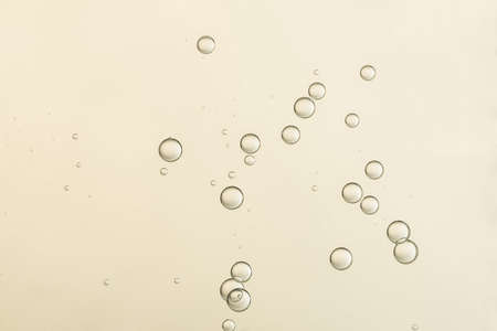 Detailed macro view of numerous transparent spherical air bubbles floating in a translucent pale pink rose gold liquid gel creating an abstract scientific or cosmetic background texture pattern.