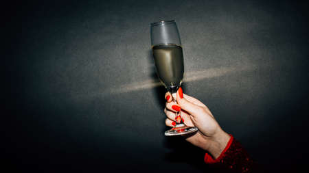 Birthday cheer. Holiday party. Happy celebration. Advertising background. Unrecognizable woman red manicure holding champagne glass isolated black light splash copy space.