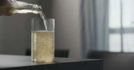 man pour soda drink from a bottle into highball glass on concrete countertop with copy space