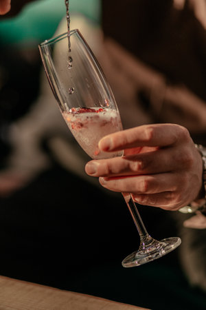 Happy Valentines day celebration concept. Man pouring sparkling champagne in glass with red heart shaped confetti. Love potion in glass. Close up