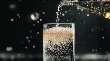 A captivating image of a sparkling drink being poured into a clear glass, showcasing bubbles and splashes against a dark backdrop, perfect for beverage promotions.
