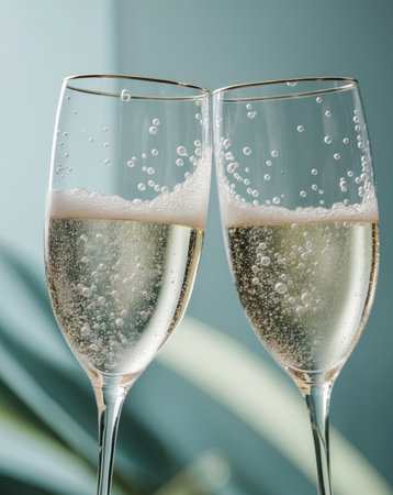 AI Generated. Close up of toasting champagne glasses with sparkling bubbles in an elegant blue and green setting