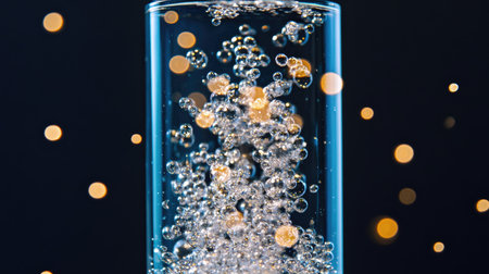 Captivating close-up shot of bubbles rising in a clear glass of sparkling liquid against a serene blue background, symbolizing refreshment and celebration.