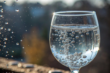 Effervescent water bubbles sparkle inside a clear glass on a bright day.