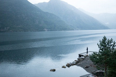 Man at Stegastein viewpoint above Aurlandsfjord in Norway