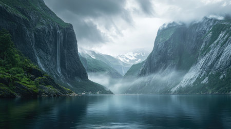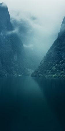Captivating view of a tranquil fjord surrounded by majestic mountains and lush greenery, creating a serene atmosphere with mist and soft clouds.