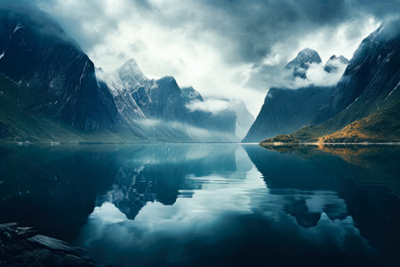 a serene landscape featuring a majestic mountain in the background. this gauzy atmospheric photo showcases calm waters and is captured in stunning 8k resolution. the dark aquamarine hues add an air of mystery to the norwegian nature scene, resembling a hidden jungle. this environmental portraiture captures the beauty of nature in a captivating way. ai generated