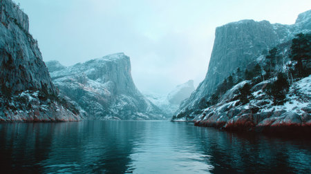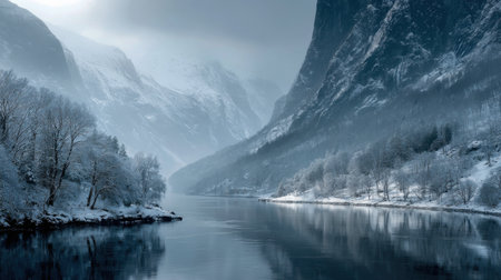 A breathtaking winter landscape displaying snow-covered mountains and calm water under a foggy atmosphere. Ideal for nature enthusiasts and travel inspiration.