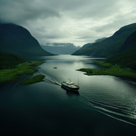 the photo showcases a serene and atmospheric landscape of calm waters. it captures the essence of norwegian nature with its moody and misty atmosphere. the image resembles a photo-realistic matte painting, depicting traditional landscapes with a sense of serenity and harmony. ai generated