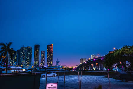 Miami city skyline at dusk with urban skyscrapers , Florida