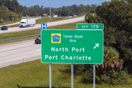 Highway interchange exit sign with direction to North Port and Port Charlotte in Florida. Interstate freeway travel in USA
