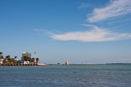 Miami landscape view on water channel, bridge with transportation on road and urban houses on cloudy blue sky background sunny day outdoor