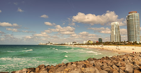 American travel destination. Southern seashore of Miami Beach city. South Beach high luxurious hotels and apartment buildings. Tourist infrastructure in southern Florida, USA