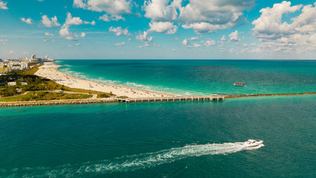 Miami beach with turquoise waters. Aerial view of sandy coastline and waves. Tropical Miami Beach scene with sandy beach. Oceanfront of South Miami. Panoramic of Miami Beach.