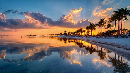 Sunset over calm waters with palm trees along the shoreline in a tropical location, creating stunning reflections and vibrant colors in the sky during early evening hours