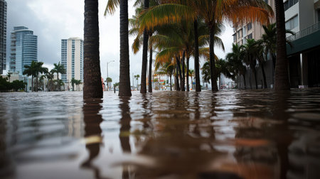 Bright sunlight illuminates a beautiful Miami beach lined with palm trees and soft white sand, inviting visitors to enjoy the serene ocean views.