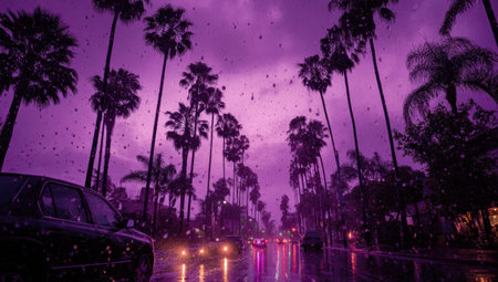 A vibrant cityscape captures palm trees silhouetted against a deep purple sky during dusk. Streetlights illuminate a wet road, reflecting the colors above. The composition presents a moody atmosphere with possible commercial applications. The artistic style conveys a sense of depth and tranquility.