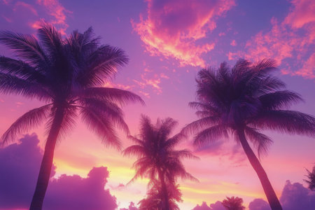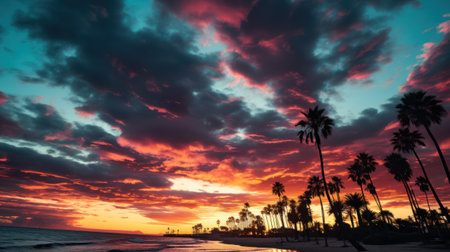 At dusk, tall palm trees create a striking silhouette against a vibrant sky filled with clouds, showingcasing shades of orange and purple near the ocean. The scene exudes tranquility and beauty.