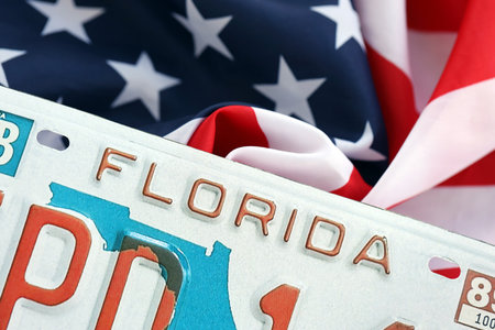 USA state of Florida license plate on US flag. Concept of driving in Florida. Reaching a driving permit