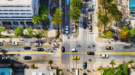 Drone view of Miami Beach's hotel district near South Beach, focusing on The Setai's elegant design amid palm-lined streets and the glistening Atlantic Ocean, perfect for travel marketing