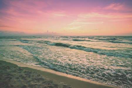 Early morning on the beach. Pink purple sunrise over the sea. Pastel color