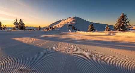 A groomed ski slope with snow-covered trees and a mountain bathed in the warm light of sunrise.