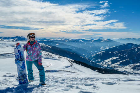 A woman posing on powder snow with her snowboard on top of Katschberg in Austria. Panoramic view on the surrounding mountains. Winter wonderland. Sunny winter day. She is full of energy and happy