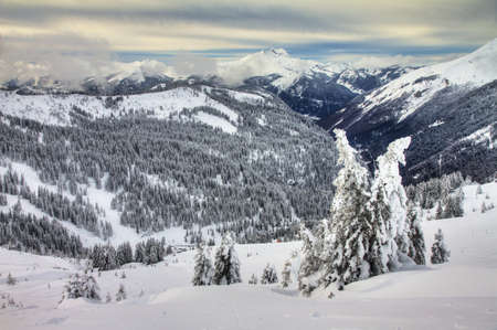 Beautiful fresh powder landscape with pine trees in Les Portes du Soleil in the European Alps HDR