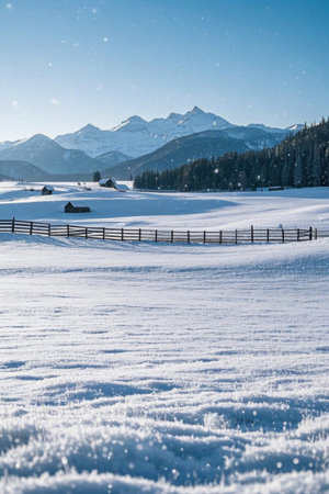 Landscape of mountains and wooden houses in the snowy fields