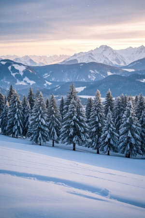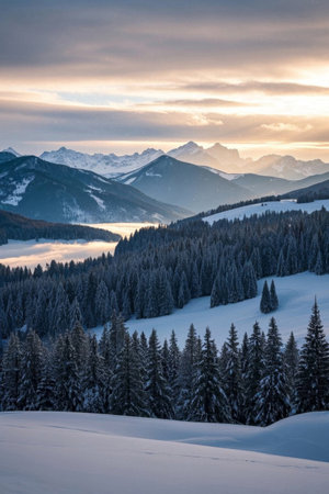 Breathtaking winter scenery of snow covered evergreen forest with mountains in the background during snowfall. High quality photo