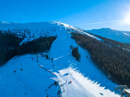 Ski resort in sunny weather. Ski slopes of a wooded mountain. Many tourists. Aerial View