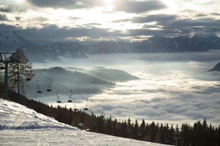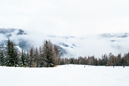 Ski resort, ski slope, ski lift, pine trees and fog mountains panorama