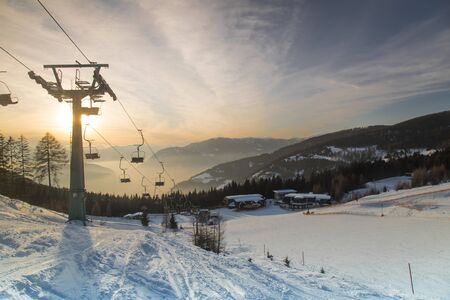 Falcade, Belluno, Italy - March 21, 2015: 4-seater chairlift Molino - Le Buse now removed in the Dolomite Alps ski area San Pellegrino