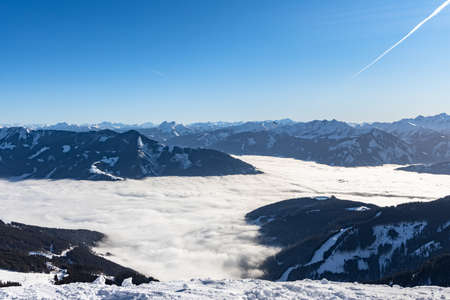 Panorama view Salzburg Alps Schimitten Schmittenhoehe, Schmittenhohe, Sonnkogel station Zell am See Kaprun Lake, blue sky fog, snow Austrian Alps mountain peaks winter sunny day, ski resort Austria