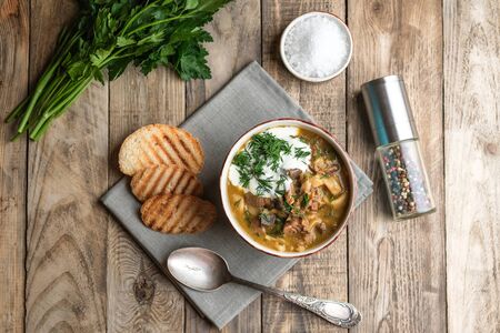 Traditional Russian meat soup Solyanka. Wooden table. Top view.