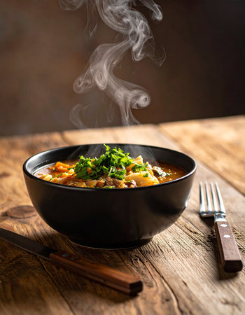 A steaming bowl of soup is appetizing and tempting, ready to be enjoyed with a variety of ingredients and flavors