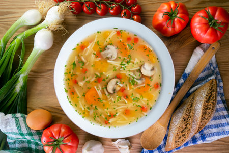 Short noodle soup with vegetables and mushrooms. Top view table with decoration.