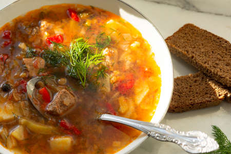 Traditional homemade Russian meat soup Solyanka with black olives and lemon