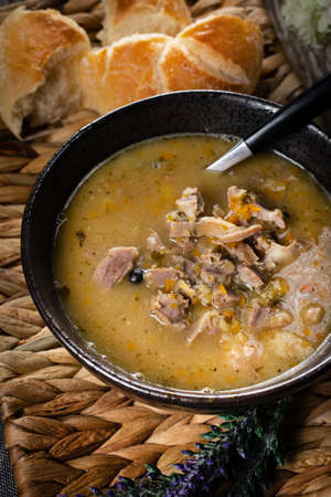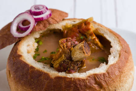 tasty delicious bean soup with smoked meat in bread
