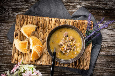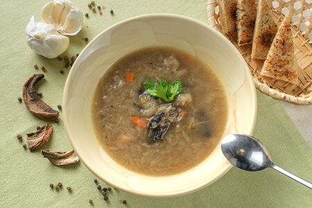 Porcini mushroom soup with potato and pearl barley. Belarusian cuisine.