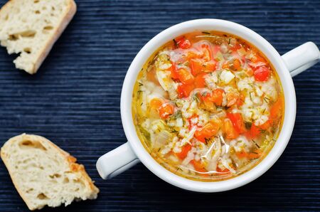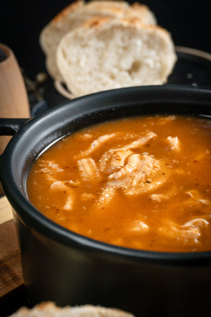 chicken soup with rice and peppers on a black background. tinting. selective focus